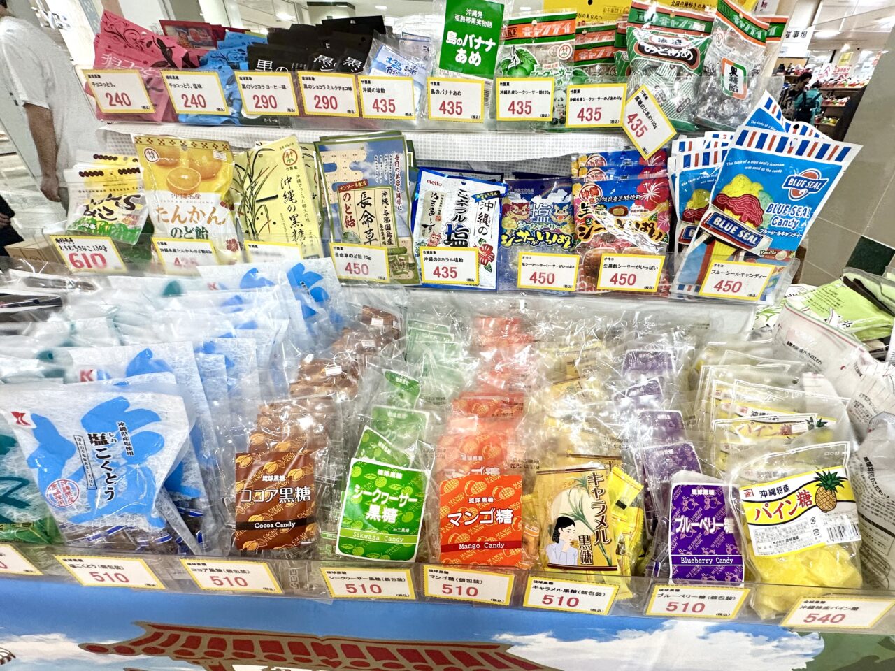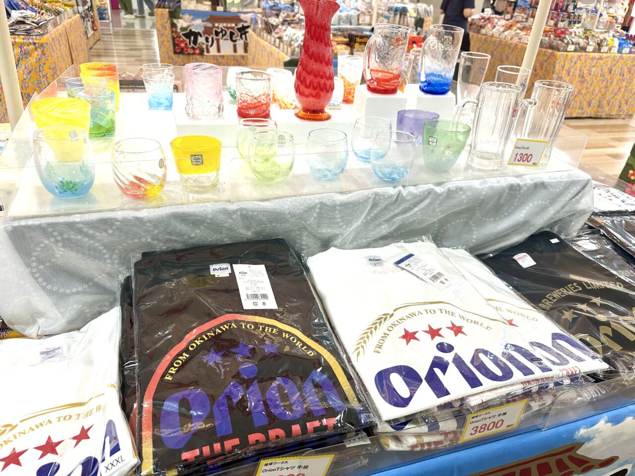 ちんすこう、黒糖、紅芋タルト、サーターアンダギー、沖縄そば、タコライス、じゅーしいの素、ジーマーミ豆腐、コーレーグース、さんぴん茶、ソーキ、ラフティ、てびち、シーサー、やちむん、OrionTシャツなど沖縄名物がずらりと揃っています!沖縄気分を満喫できそうなものばかりで、カラフルな雑貨や美味しそうなお菓子など、見ているだけで楽しくなりそうですね♪