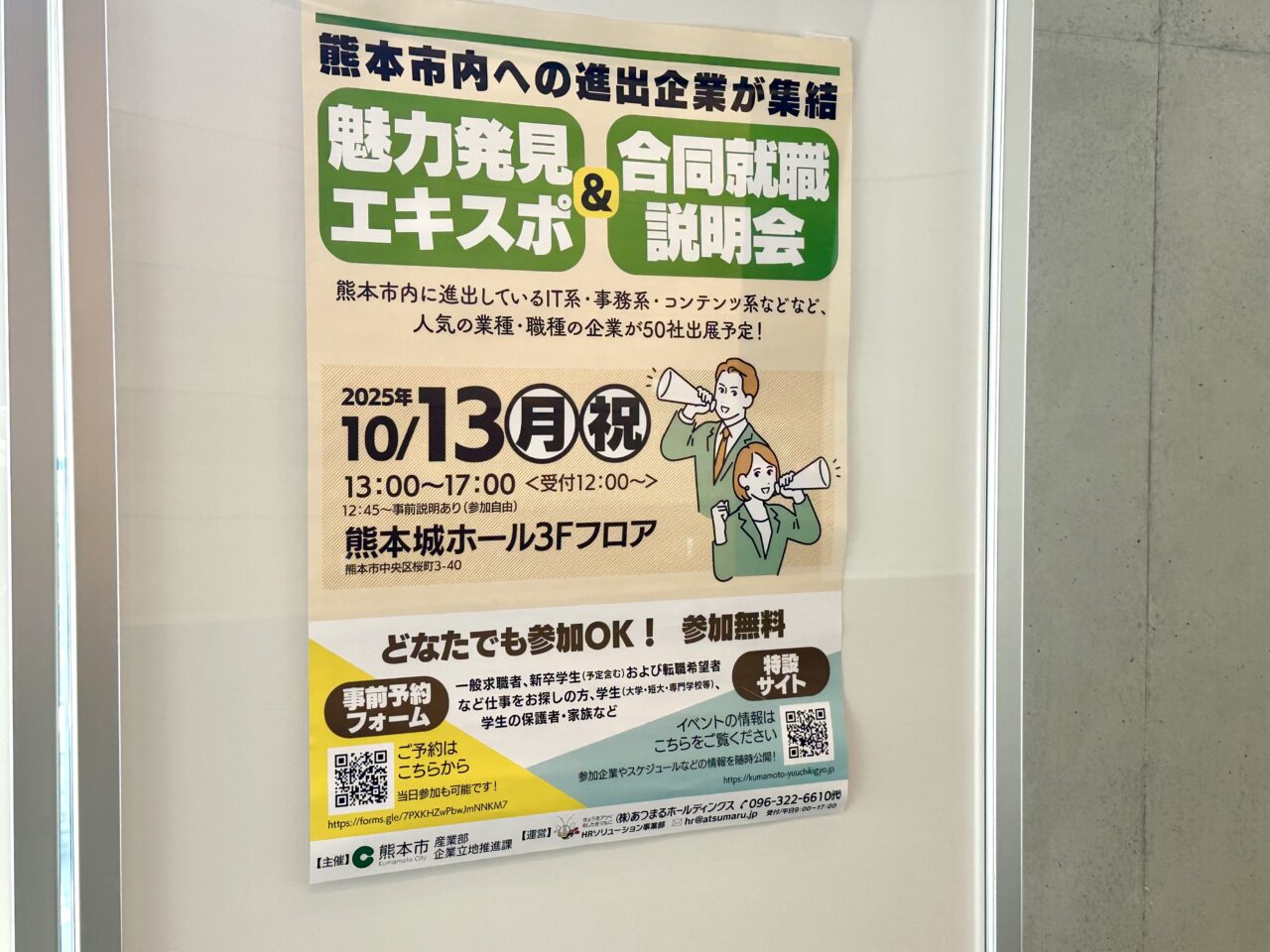 2025年10月13日(月)に、「熊本市内への進出企業が集結!魅力発見エキスポ&合同就職説明会」が熊本城ホール3Fフロア(熊本市中央区桜町)にて開催されます。