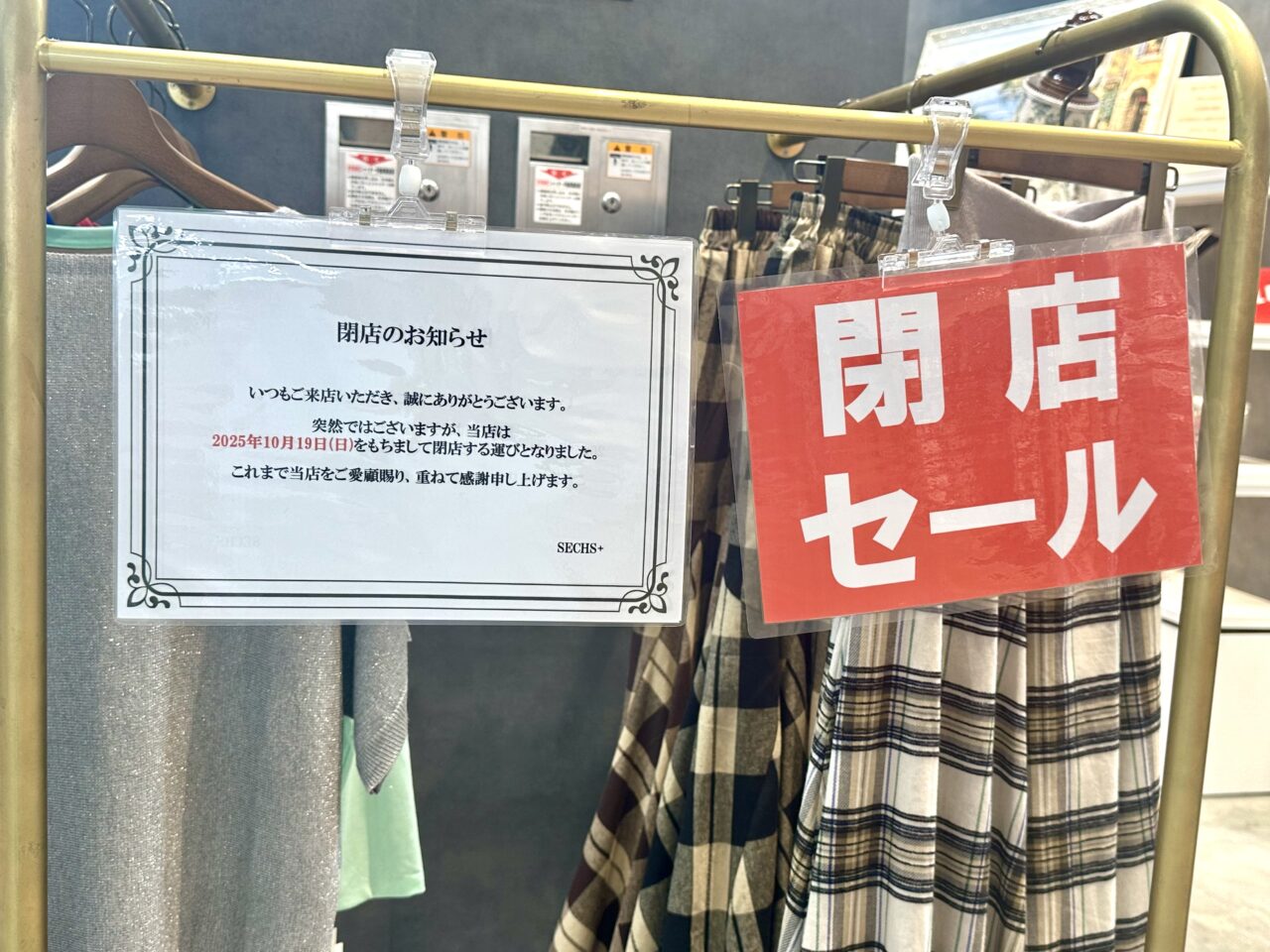ゆめタウンはません1階にある、レディースファッションのセレクトショップ「SECHS+ (ゼクスプラス)」が2025年10月19日(日)に閉店するようです。
