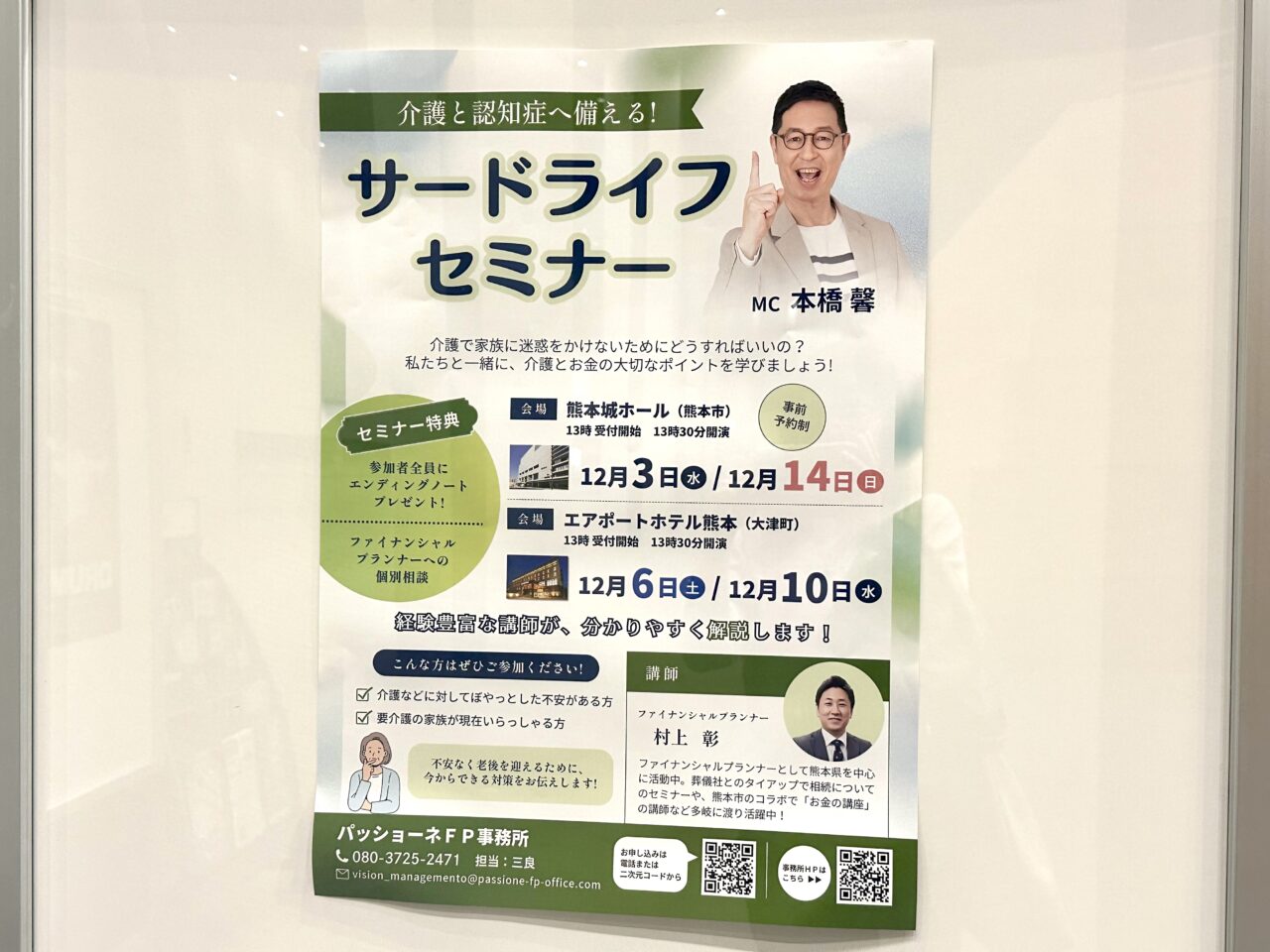 2025年12月3日(水)、12月14日(日)に、「介護と認知症へ備えるサードライフセミナー」が熊本市中央区桜町の熊本城ホールにて開催されるようです。参加費は無料(要事前予約)!