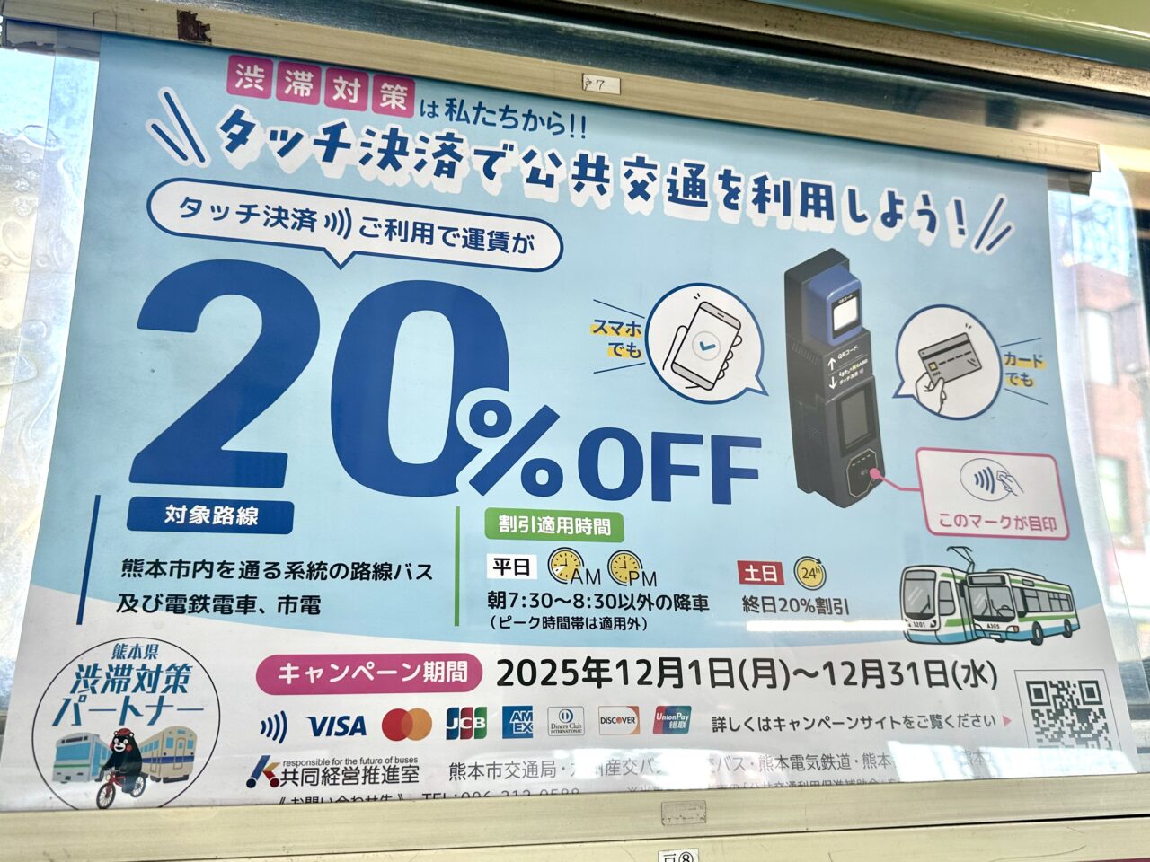 【熊本市】12月31日まで!クレジットカード等のタッチ決済で熊本市電やバス等が20%割引になるキャンペーンが行われています。
