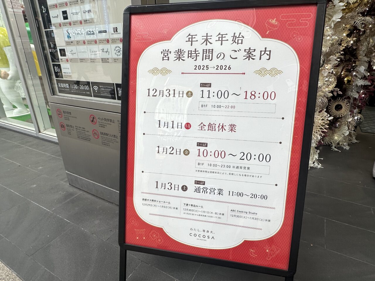 COCOSAの年始の営業は、2026年1月1日(木・祝)全館休業、1月2日(金)10:00~20:00、1月3日(土)11:00~20:00(通常営業)となるようです。
