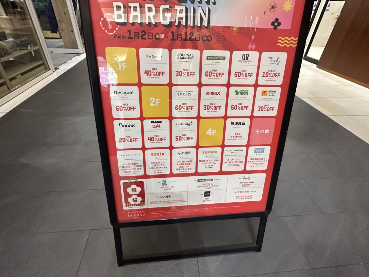 「COCOSA NEW YEAR BARGAIN 」は1月2日(金)10:00にスタート!最大60%OFF・20店舗参加!COCOSAカード会員様は、水・日曜日5%OFFでさらにお得になるようです。