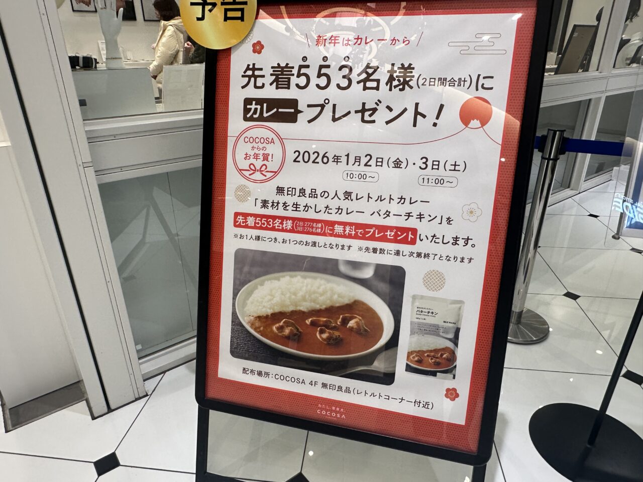 2026年1月2日(金)10:00~、1月3日(土)11:00~にCOCOSA4F無印良品(レトルトコーナー付近)にて新年初のイベントとして、お年賀プレゼントが実施されます。「無印良品」の素材を生かしたカレーバターチキンカレーを553名様(2日間合計)に無料でプレゼントとのことです♪※お1人様につき、おひとつのお渡し。※各日先着数に達し次第終了。