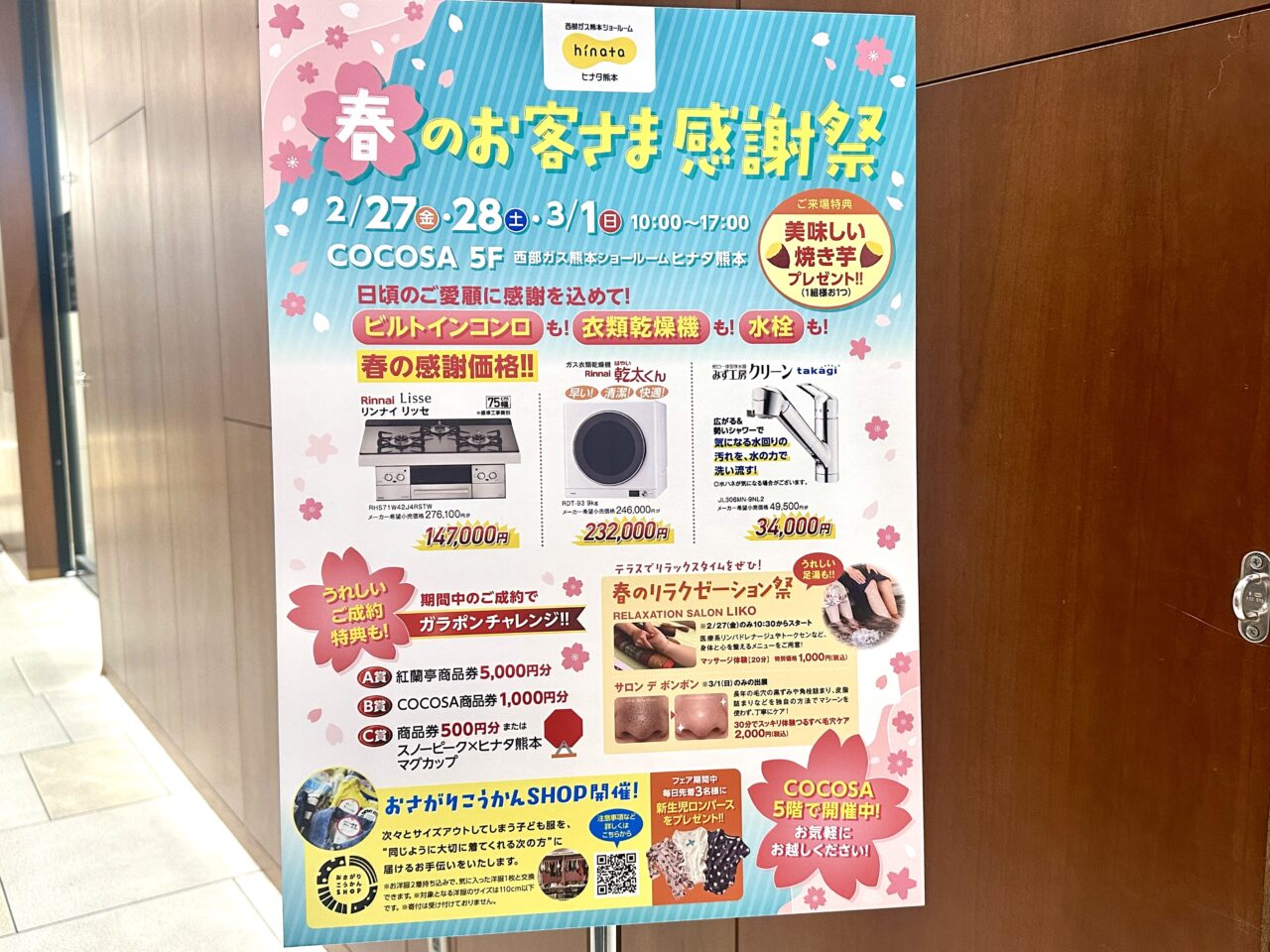 2026年2月27日(金)~3月1日(日)の3日間、COCOSA5Fの西部ガス熊本ショールーム ヒナタ熊本にて、『春のお客さま感謝祭』が開催!ホームページによると、「ビルトインコンロ・乾太くん・給湯器など、人気のガス機器が“春の大決算価格”で大放出!・来場者特典:美味しい“焼き芋”をプレゼント!(1組様お1つ)・おさがりこうかんSHOP :お子さまのお洋服を2着持ち込みで、気に入ったお洋服 1着と交換できます・成約特典:豪華ギフト券が当たるガラポン抽選会・サロン出張企画:毛穴ケア・リンパケア・足湯などリラクゼーション体験・住まいの相談:給湯器・コンロ・水栓の買い替えもお任せ!」とのことです。気軽に立ち寄ってみてはいかがでしょうか?