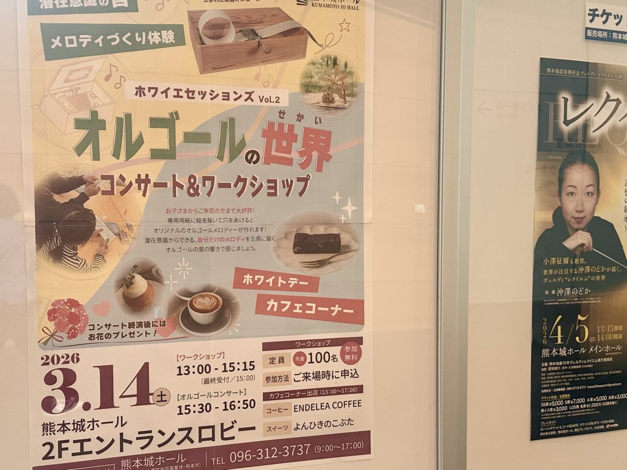 2026年3月14日(土)に、「ホワイエ・セッションズvol.2 オルゴールの世界~コンサート&ワークショップ~」が熊本城ホール2Fエントランスロビーで開催されます。