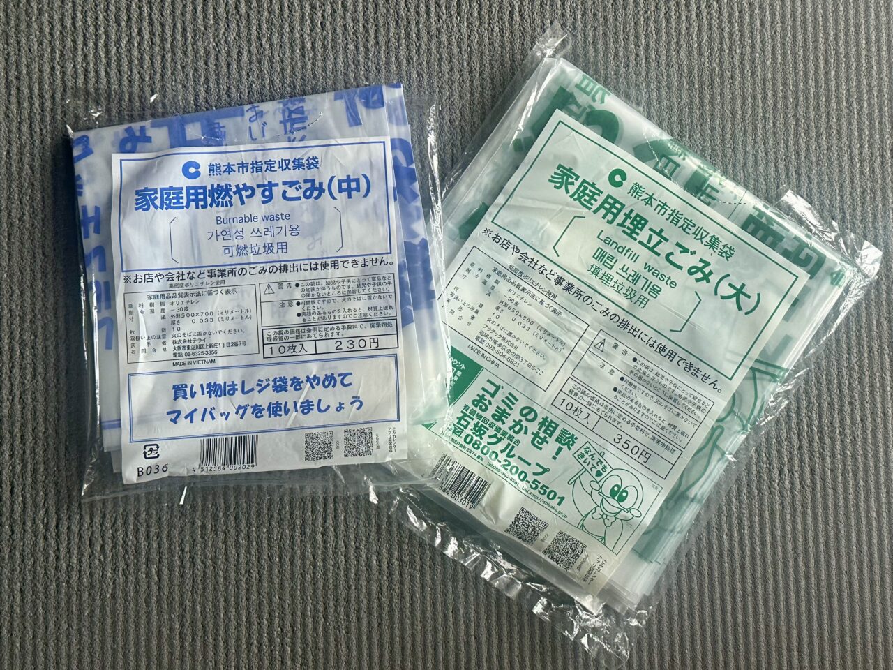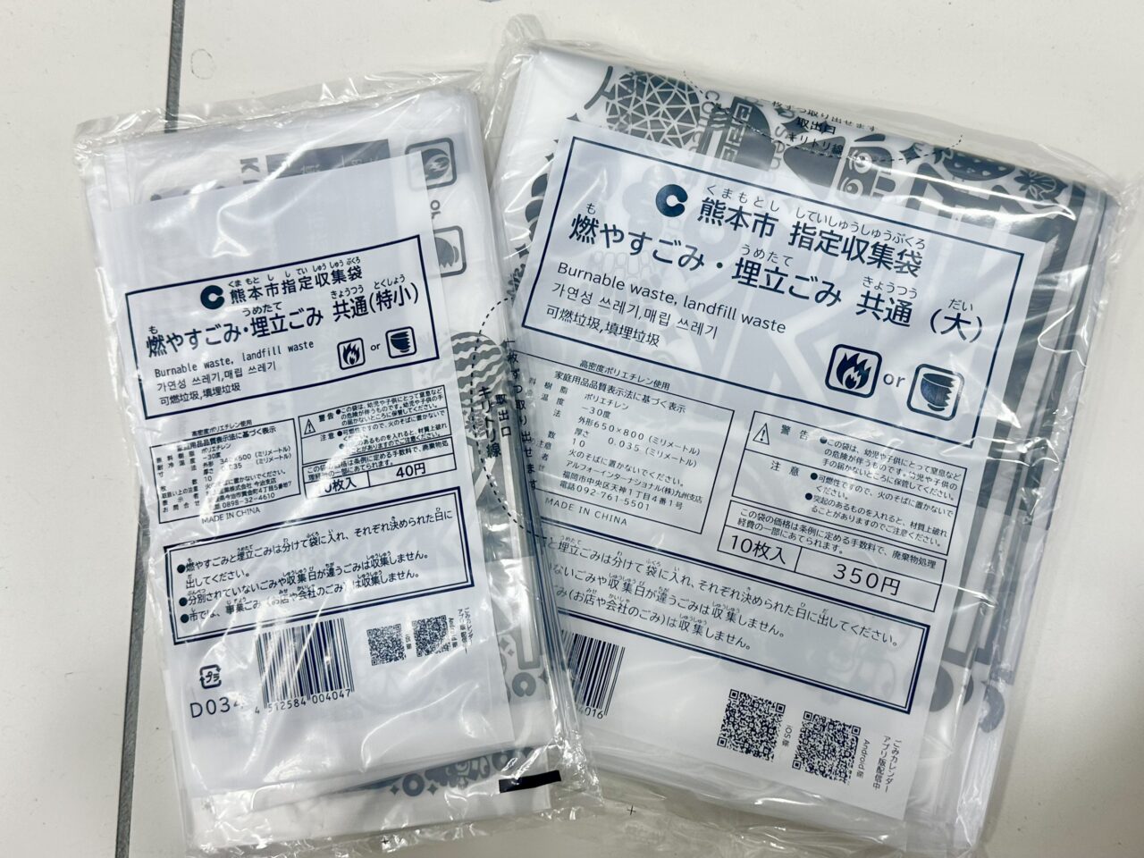令和8年4月から、熊本市では燃やすごみ・埋立ごみ共通の新しい指定収集袋が使えるようになりました。熊本市のホームページによると、熊本市では、平成21年10月1日から「家庭ごみ有料化」を実施し、燃やすごみと埋立ごみは、指定収集袋(以下「指定袋」)に入れて出しています。 指定袋の利便性について様々な要望が寄せられていたことから、見直しを行い、新しい指定袋を販売することになったそうです。従来の指定袋(上記写真)は、燃やすごみ用(袋は半透明、文字は青)、埋立ごみ用(袋は透明、文字は緑)の2種類。新しい指定袋は、燃やすごみ・埋立ごみ共通(袋は半透明、文字は黒)。